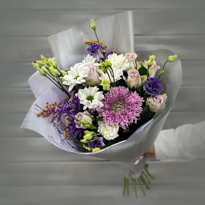 Букет из хризантем, лизиантусов и сиреневых роз| 4 100 Р | без скидки |