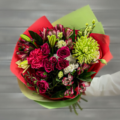 Букет из гвоздик, альстромерий, хризантем и роз| 5 400 Р | без скидки |
