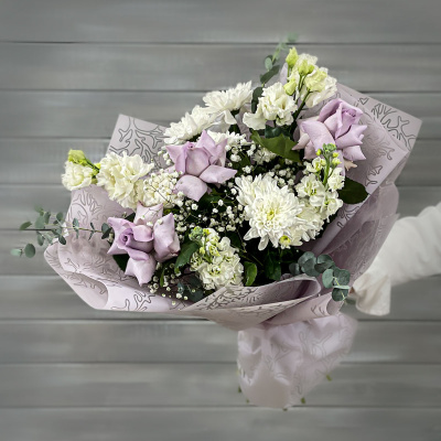 Букет из сиреневых роз, маттиол и хризантем| 5 200 Р | без скидки |