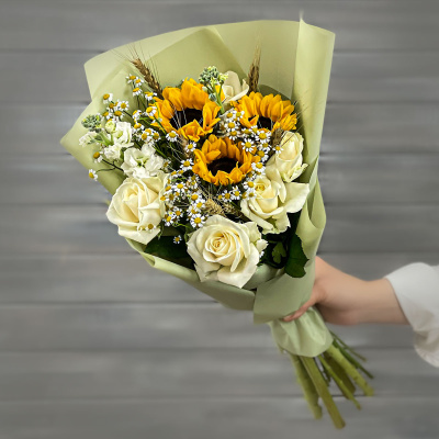 Букет из подсолнухов, роз и ромашек| 4 600 Р | без скидки |
