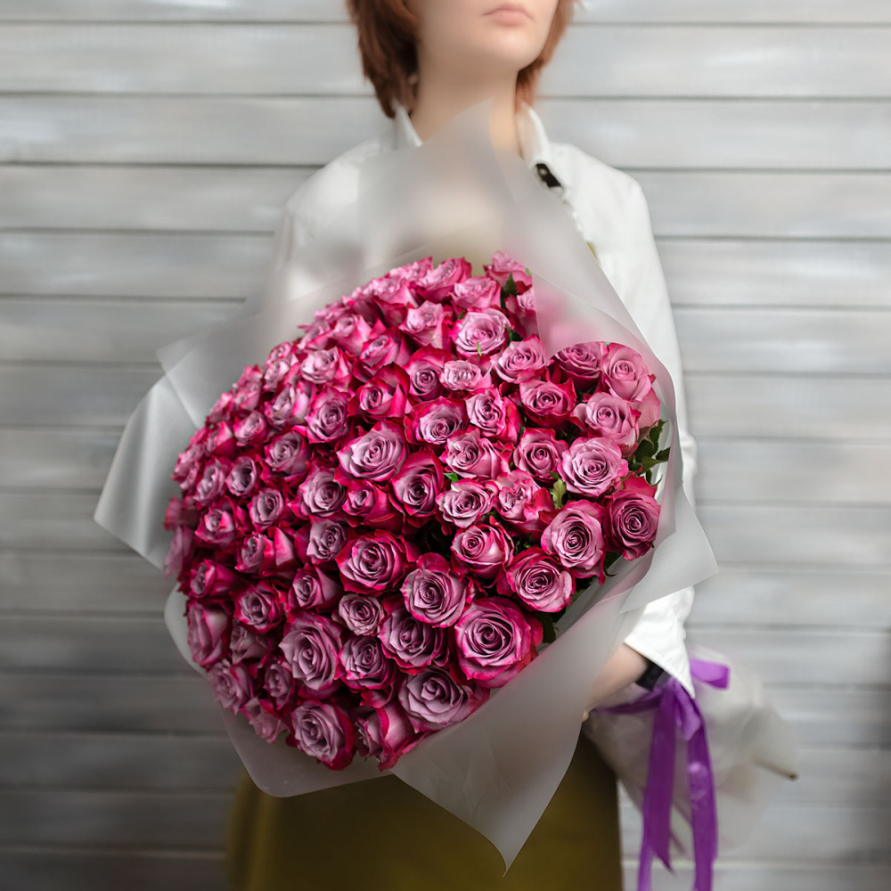 101 фиолетовая роза в упаковке Эквадор 50 см