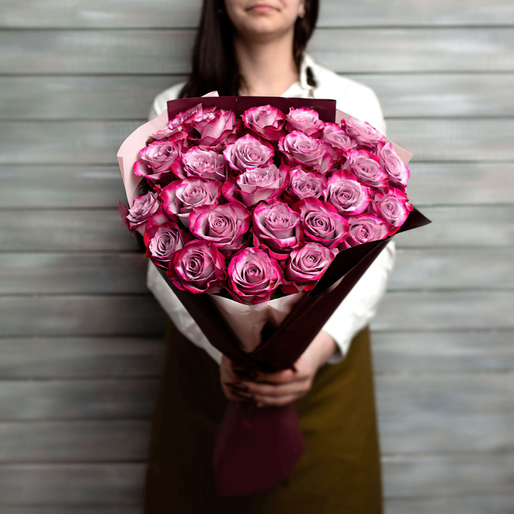 27 фиолетовых роз Эквадор 60 см в упаковке