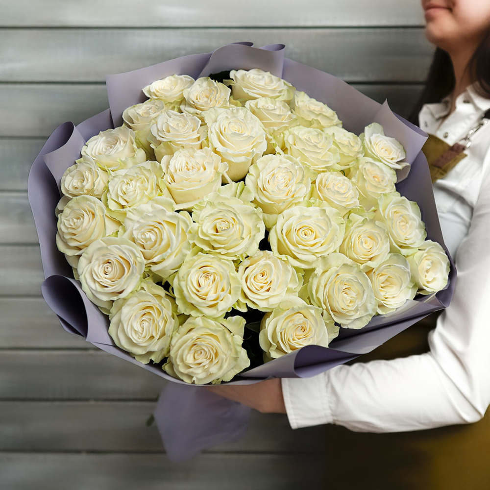 33 белые розы Эквадор 60 см в упаковке