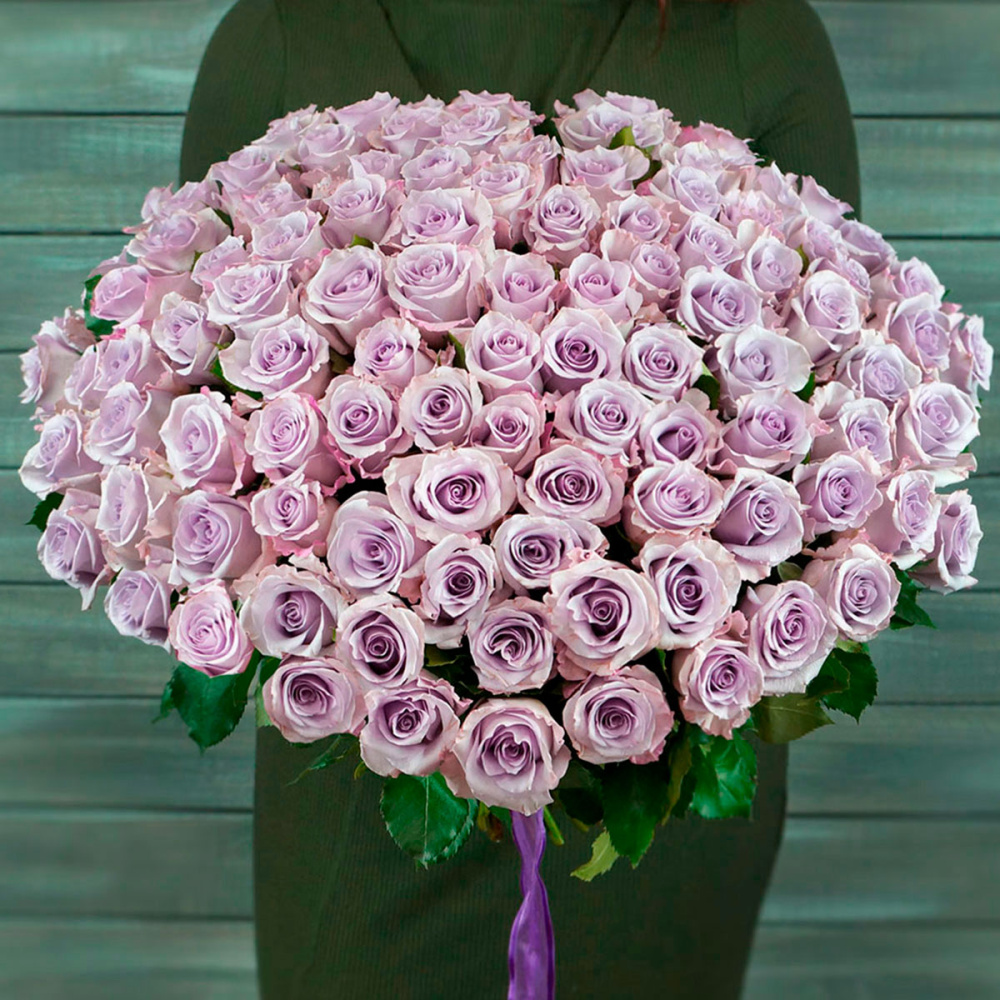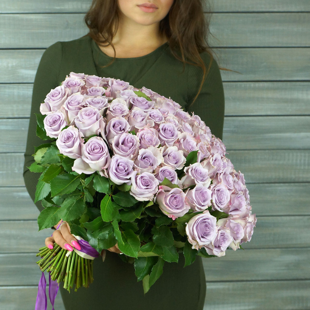 75 сиреневых роз с лентой Кения 40 см.