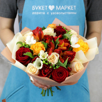 Роза 30 см красная, Роза 40 см розовая, Роза РС 40 см кремовая, Роза РС 50 см красная, Фрезия белая, Альстромерия желтая, Упаковка в ассортименте, Лента, Плёнка прозрачная
