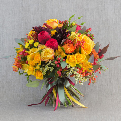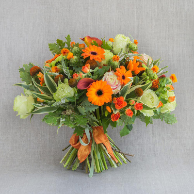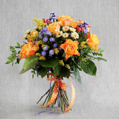 Маттиола кремовая, Роза кустовая Клустер кремовая, Хамелациум, Хризантема кустовая желтая, Ранункулюс оранжевый, Гвоздика оранжевая, Лимониум фиолетовый, Листья эвкалипт с яг/цв/краш, Упаковка ББ
