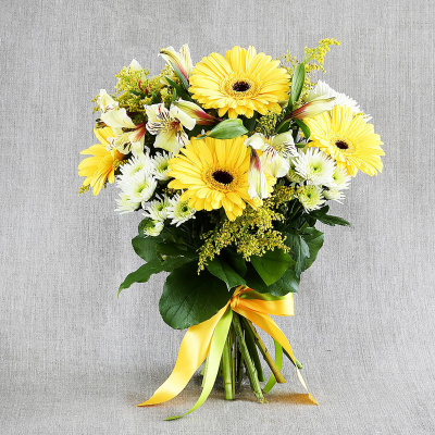 Гербера желтая, Альстромерия желтая, Солидаго микс, Листья салал, Хризантема сантини зеленая, Лента, Упаковка ББ