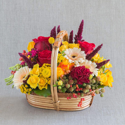 Корзина плетеная стандарт бол, Плёнка прозрачная, Оазис кирпич, Роза кустовая 50 см оранжевая, Гербера мини белая, Роза Фридом 60 см, Ежевика (Рубус), Роза 40 см розовая, Амарантус, Гвоздика оранжевая, Бовардия фиолетовая, Ахилея, Вибурнум тинус (пучок), Листья галакс, Лента с логотипом (ББ)