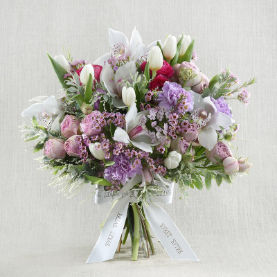 Роза кустовая Клустер кремовая, Гвоздика лунная фиолетовая, Хамелациум, Орхидея Цимбидиум белая, Ранункулюс оранжевый, Тюльпан малиновый, Мимоза цветущая, Упаковка ББ