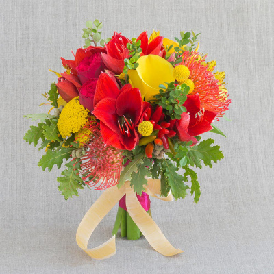 Амариллис красный, Нутан, Альстромерия желтая, Калла 60 см белая, Ахилея, Перец паприка, Краспедия, Листья мирсины, Листья дуба (пучок), Роза Александра розовая, Лента, Упаковка ББ