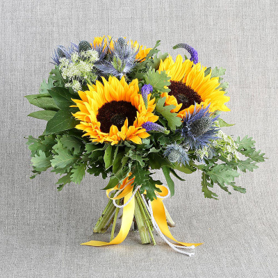 Подсолнух, Амми, Эрингиум, Вероника фиолетовая, Листья дуба (пучок), Листья салал, Лента, Шнур декоративный, Упаковка ББ