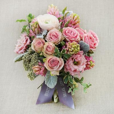 Гиацинт синий, Ранункулюс оранжевый, Лизиантус, Сенецио Маритима, Листья питтоспорума микс, Озатамнус, Листья эвкалипт микс, Роза кустовая 60 см кремовая, Роза 40 см розовая, Упаковка ББ