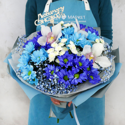 Хризантема кустовая желтая, Хризантема куст. ВС фиолетовая, Орхидея Цимбидиум белая, Гипсофила краш., Бумага упаковочная Тишью, Вставка Слова дерево, Упаковка в ассортименте, Лента, Плёнка прозрачная