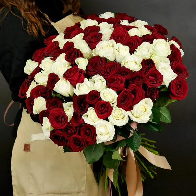Букет из 101 красной и белой розы с лентой Россия 60 см.| 18 200 Р | без скидки |