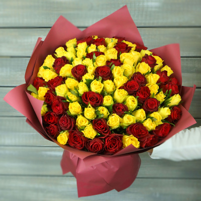 Букет из 101 красной и желтой розы в упаковке Россия 60 см.| 17 000 Р | без скидки |