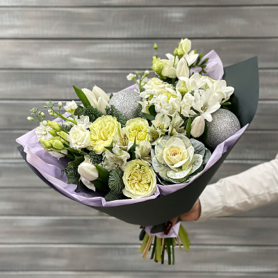 Лизиантус,Альстромерия,Фрезия,Роза Александра,Тюльпан,Маттиола,Крафт цветной,Бумага упаковочная Тишью,Нобилис Ёлка (пучок),Шар новогодний 230 (за1шт),Лента,Плёнка прозрачная