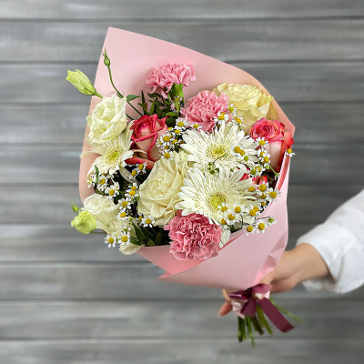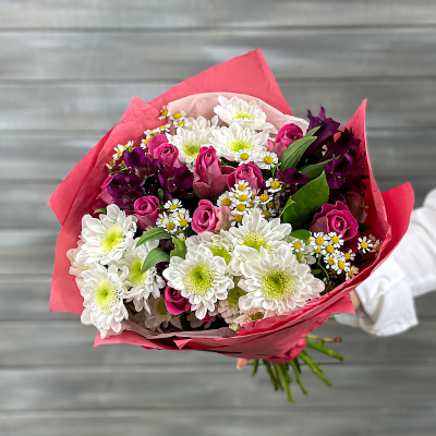 Роза 40 см,Альстромерия,Хризантема кустовая,Ромашка (Танацетум),Листья салал,Листья фисташки,Бумага упаковочная Тишью,Упаковка в ассортименте,Лента,Плёнка прозрачная