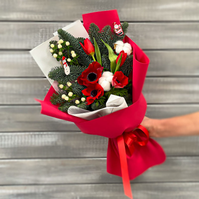 Анемон,Нобилис Ёлка (пучок),Гиперикум,Прищепка НГ,Бумага упаковочная подарочная 70см,Лента,Тюльпан,Хлопок,Плёнка прозрачная