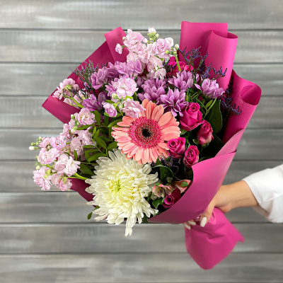 Гербера,Маттиола кустовая ,Роза 40 см,Хризантема краш одноголовая / ВС,Лимониум,Хризантема кустовая,Альстромерия,Упаковка в ассортименте,Лента,Плёнка прозрачная