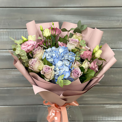 Гортензия,Лизиантус,Роза Оушен сонг 40 см - 50 см,Листья эвкалипт микс,Упаковка в ассортименте,Плёнка прозрачная,Лента