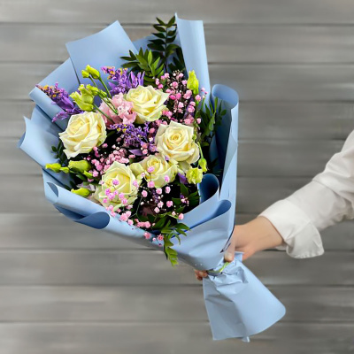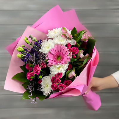 Лимониум,Гербера,Хризантема кустовая,Кустовая роза 60 см РС,Лизиантус,Альстромерия,Листья салал,Упаковка в ассортименте,Лента,Плёнка прозрачная