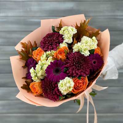 Маттиола,Хризантема одноголовая,Гербера мини,Роза Эквадор 60 см,Листья дуба крашеные (пучок),Упаковка в ассортименте,Лента,Плёнка прозрачная