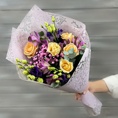 Букет из альстромерий, роз и лизиантусов| 4 300 Р | без скидки |