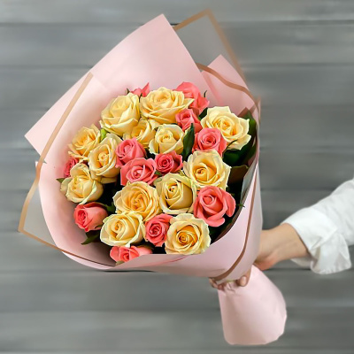 Букет из 25 кремовых и коралловых роз Россия 60 см.| 4 800 Р | без скидки |