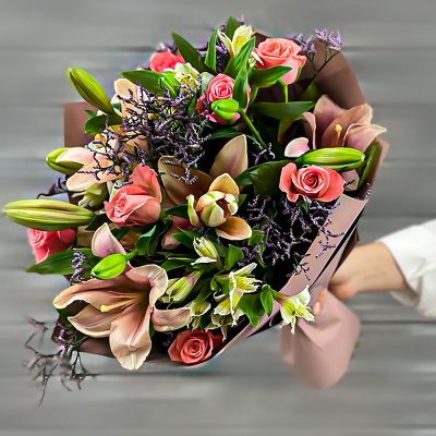 Лилия азия,Роза РС 60 см,Лимониум,Альстромерия,Листья фисташки,Упаковка в ассортименте,Лента,Плёнка прозрачная