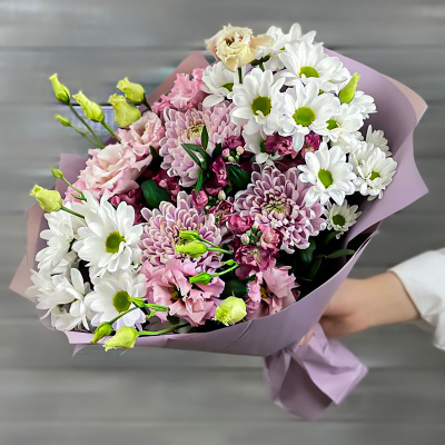 Хризантема кустовая,Хризантема одноголовая,Лизиантус,Упаковка в ассортименте,Лента,Плёнка прозрачная