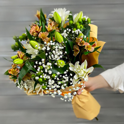 Букет из лилий, альстромерий и гипсофилы| 5 900 Р | без скидки |