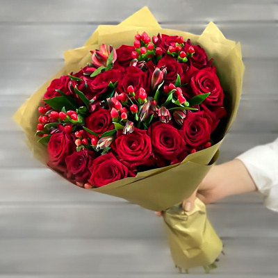 Букет из красных роз, альстромерий и гиперикума| 6 600 Р | без скидки |