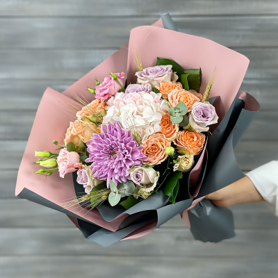 Хризантема одноголовая,Гортензия,Роза кустовая Клустер,Роза Оушен сонг 40 см - 50 см,Лизиантус,Тритикум пшеница (Сушеный),Листья салал,Листья эвкалипт микс,Упаковка в ассортименте,Лента,Плёнка прозрачная