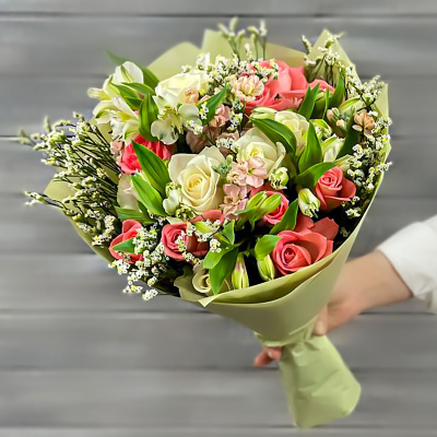 Букет из роз, альстромерий и эустом| 5 400 Р | без скидки |
