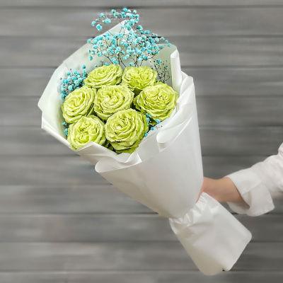 Роза кустовая Клустер,Буплерум,Статица,Упаковка в ассортименте,Лента,Плёнка прозрачная