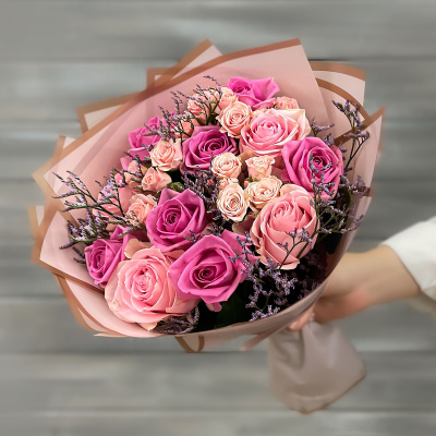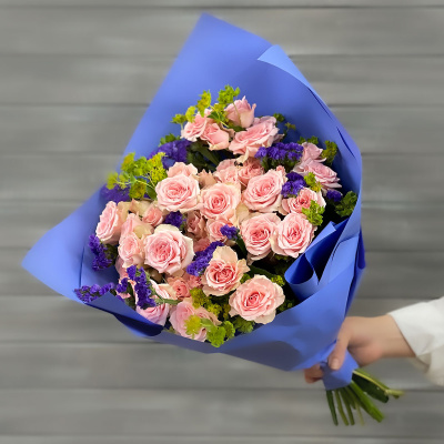 Букет из розовых роз с лимониумом| 4 500 Р | без скидки |