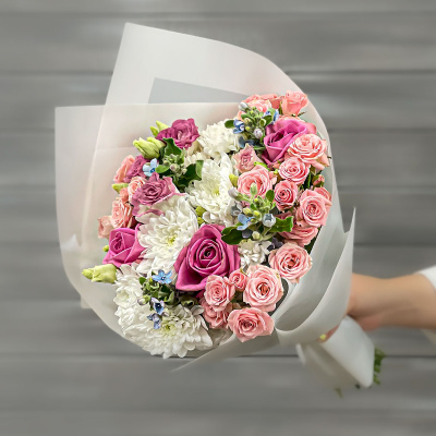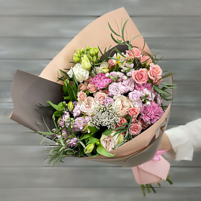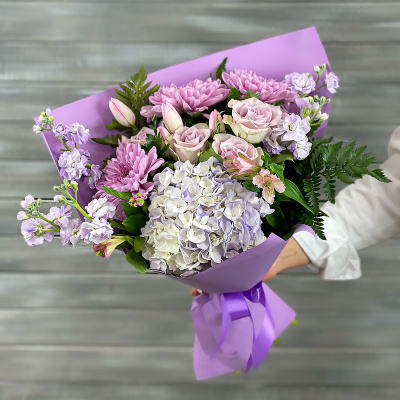 Гортензия,Лизиантус,Роза 40 см,Роза кустовая Клустер,Маттиола кустовая ,Гвоздика,Альстромерия,Упаковка в ассортименте,Лента,Плёнка прозрачная