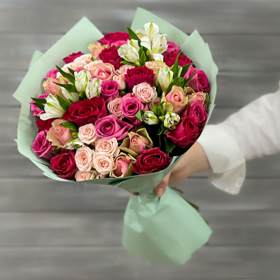 Букет из розовых роз и альстромерий| 5 100 Р | без скидки |