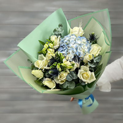 Роза РС 60 см,Эрингиум,Альстромерия,Листья эвкалипт микс,Гортензия,Тритикум краш (пучок) пшеница,Упаковка в ассортименте,Лента,Плёнка прозрачная