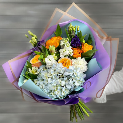 Нежный букет из гортензии, роз и маттиолы| 6 400 Р | без скидки |
