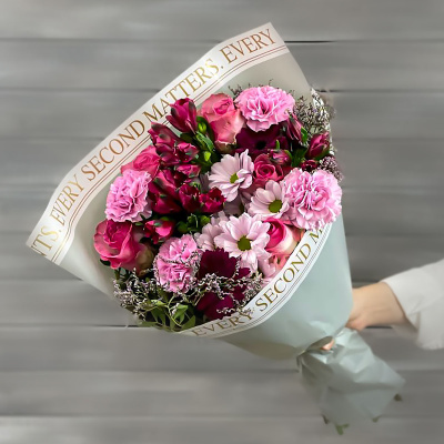 Хризантема кустовая,Роза РС 60 см,Гвоздика,Гербера,Лимониум,Альстромерия,Листья фисташки,Упаковка в ассортименте,Лента,Плёнка прозрачная