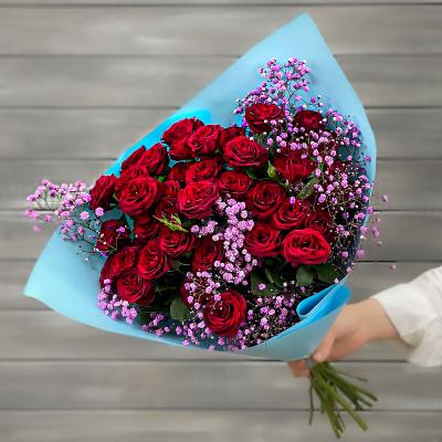 Роза кустовая Клустер,Гипсофила краш.,Упаковка в ассортименте,Лента,Плёнка прозрачная