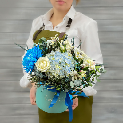 Композиция в шляпной коробке из роз, гортензии и альстромерий| 6 400 Р | без скидки |
