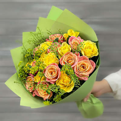 Букет из 19 желтых и коралловых роз Россия 60 см.| 5 400 Р | без скидки |