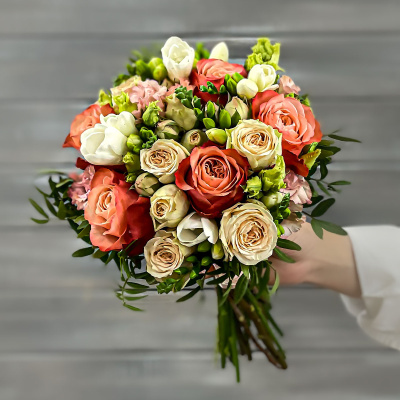 Букет пионовидных роз, фрезий и лизиантусов| 5 700 Р | без скидки |