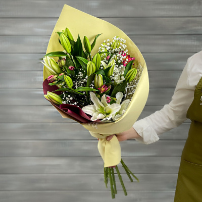 Букет из лилий с альстромериями и гипсофилой| 6 300 Р | без скидки |