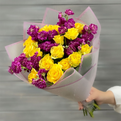 Роза РС 40 см,Маттиола кустовая ,Упаковка в ассортименте,Лента,Плёнка прозрачная