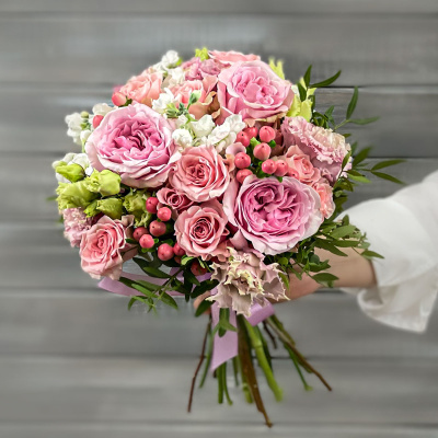Роза Александра,Гиперикум,Маттиола,Роза кустовая 50 см,Лизиантус,Лента,Плёнка прозрачная