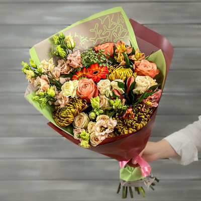 Сборный букет из роз, лизиантусов и хризантем| 6 400 Р | без скидки |