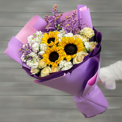 Букет из подсолнухов, маттиолы и роз| 4 900 Р | без скидки |